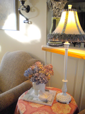 Do you see my fifty cent column peeking out from behind the lamp? I painted it black and green and distressed it with paint. I also spruced up the lamp shade with ribbon and fringe. The custom look cost mere dollars to create.
